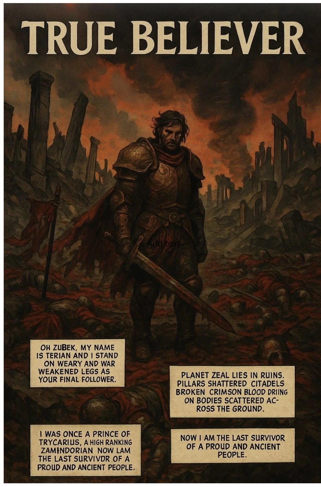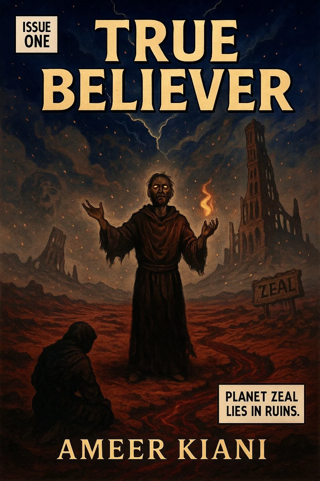 In True Believer, Ameer Kiani tells the story of Terian, a fallen prince who survives the destruction of Planet Zeal. Surrounded by the corpses of his own people, betrayed by zealots, and outmatched by the towering Nustarians, he becomes the last witness to a civilization’s collapse. His journey begins in blood, smoke, and fading faith.